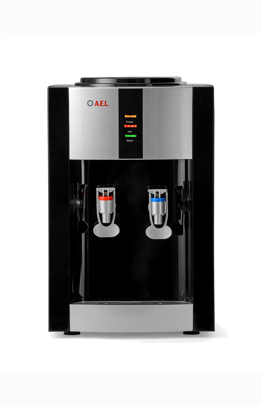Настольный кулер с компрессорной системой охлаждения черного цвета с серебряными вставками. Отличается высокой производительностью (нагревает до 5 л и охлаждает до 2 л воды в час). Охлаждение и нагрев воды можно отключить с помощью тумблеров на задней панели кулера. Оснащен кранами типа "нажим кружкой с внутренней резьбой». Изготовлен из высококачественного пищевого пластика, а боковые черные стенки сделаны из металла, что позволяет крепить держатель на магните.