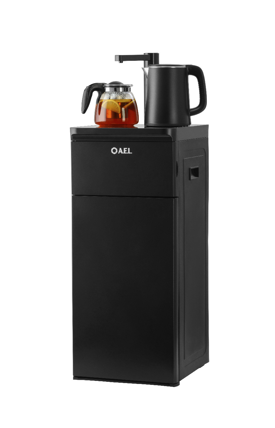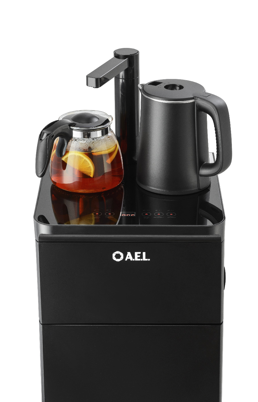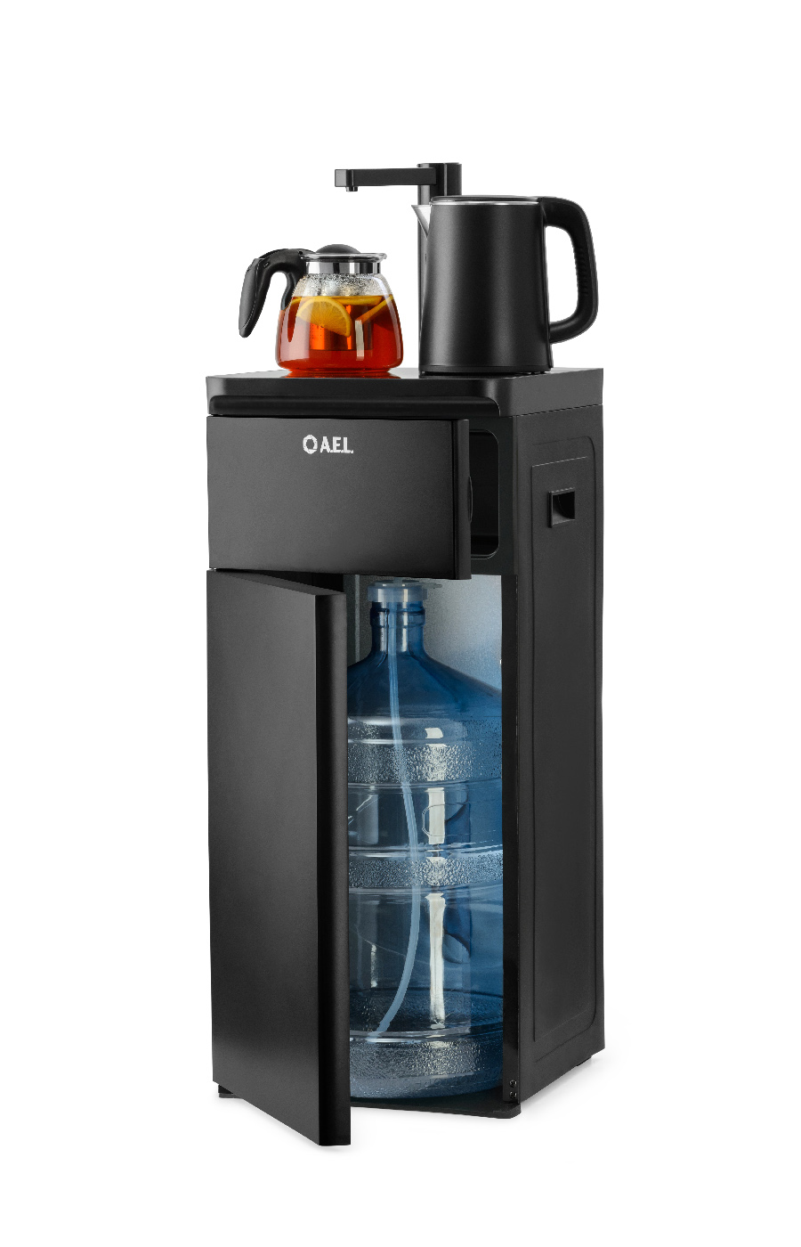 Оригинальное исполнение кулера с нижней загрузкой бутыли и без охлаждения, состоит из заварочного и электрического чайников, сенсорной панели управления и шкафчика для хранения.