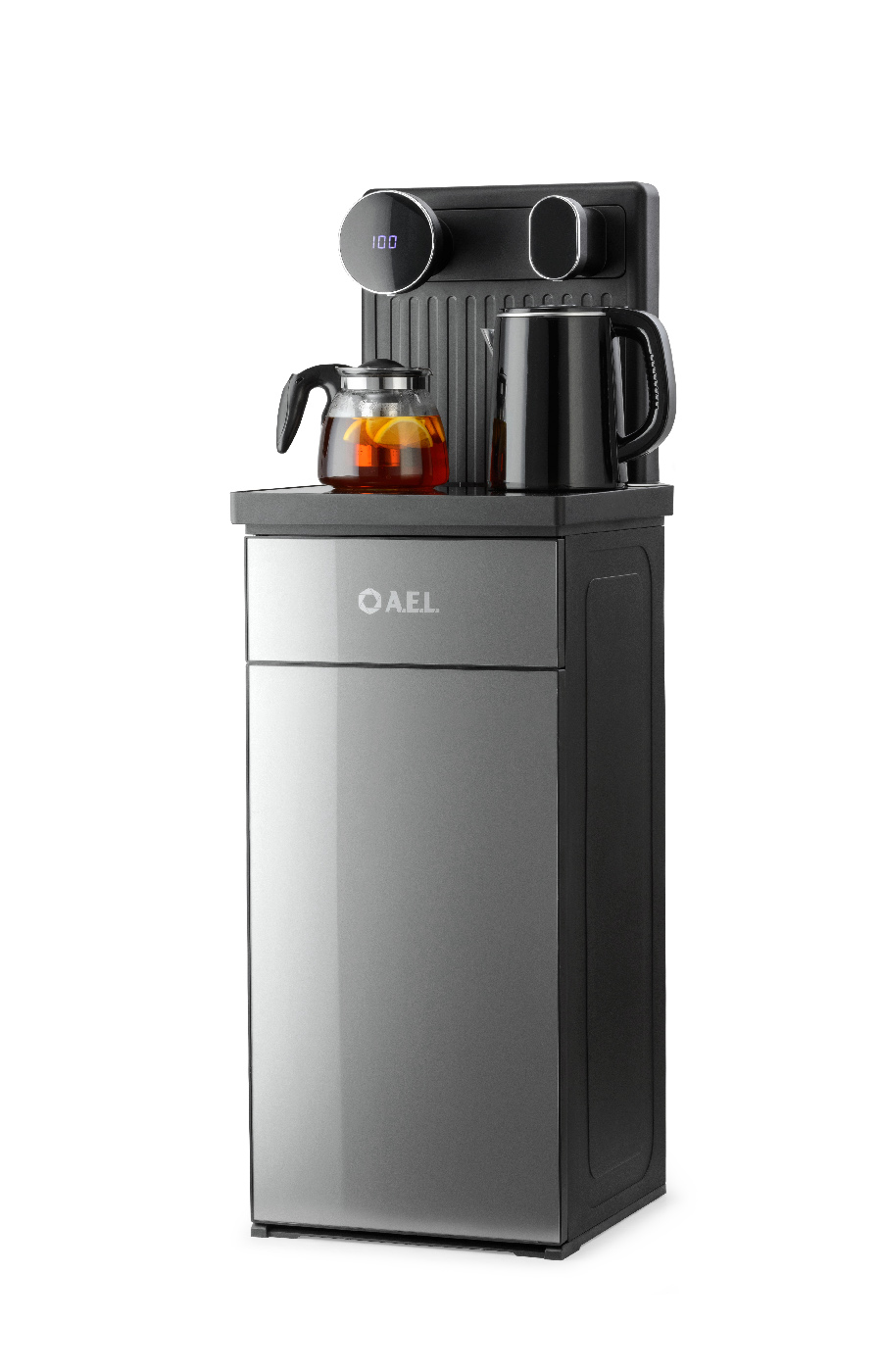 Оригинальное исполнение кулера с нижней загрузкой бутыли и без охлаждения, состоит из заварочного и электрического чайников, сенсорной панели управления и шкафчика для хранения. Яркая световая индикация и информативный дисплей на сенсорной панели сообщат о текущем режиме и подключении к сети. Цвет серый. Боковые стенки пластиковые. Объем чайников 1 литр. Размер в собранном виде 330x325x 995мм. Высота от пола до столешницы с чайниками 700мм.Скорости подачи воды комнатной температуры 1 л/мин